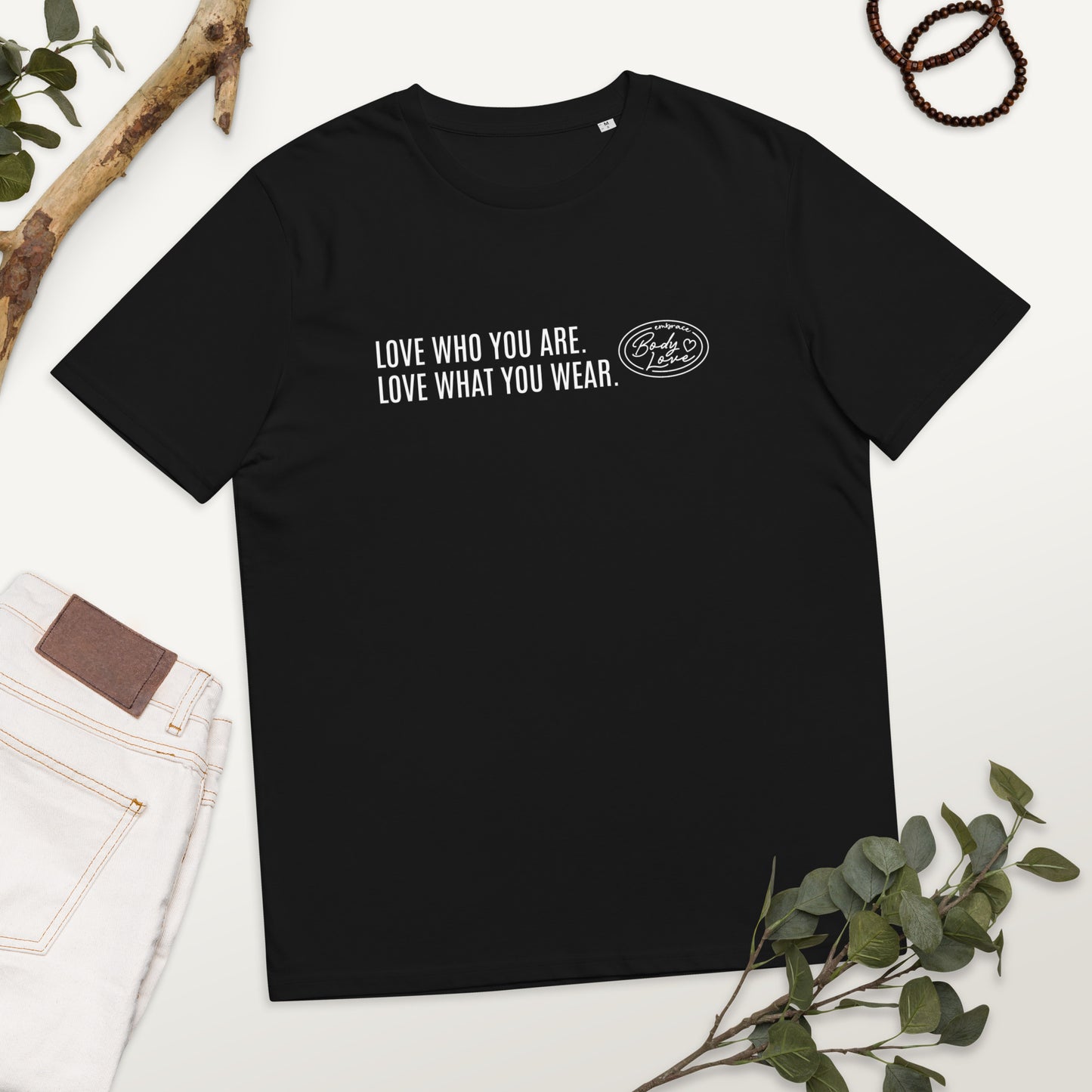 "Love Who You Are" Genderless Organic Cotton T-shirt (Embrace Body Love Logo)